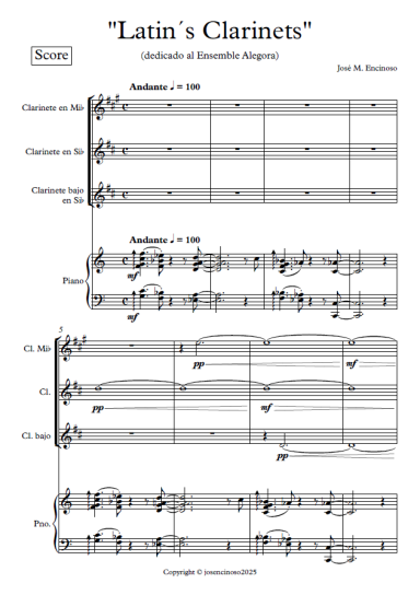 Para clarinete Eb, clarinete Bb, clarinete bajo y piano.