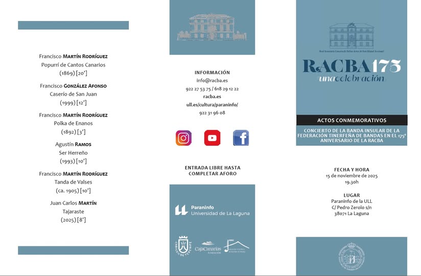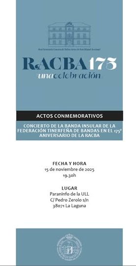 EL pasado sábado tuve el placer de dirigir a la Banda Insular de la Federación Tinerfeña con motivo del 175º aniversario de la RACBA (Real Academia Canaria de Bellas Artes). Seis obras de compositores canarios, miembros de la academia. En el concierto se interpretó un estreno absoluto y tres obras musicales rescatadas de la historia, tras la minuciosa investigación de D. Conrado Álvarez. Obras que fueron interpretadas la última vez hace más de 120 años.